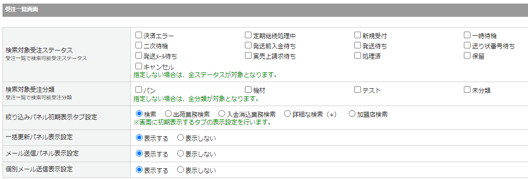 一括更新パネル表示設定受注一覧画面の一括更新パネルの表示を設定します。