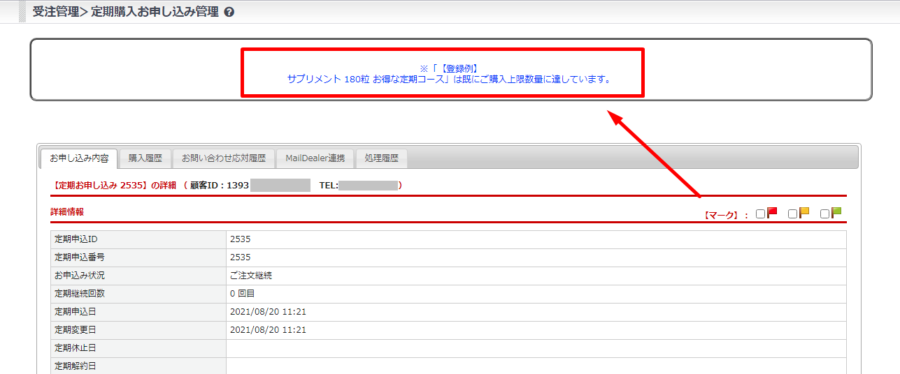 受注>定期購入お申込み登録から定期データを作成する際、購入制限設定によるエラーにはなりません。