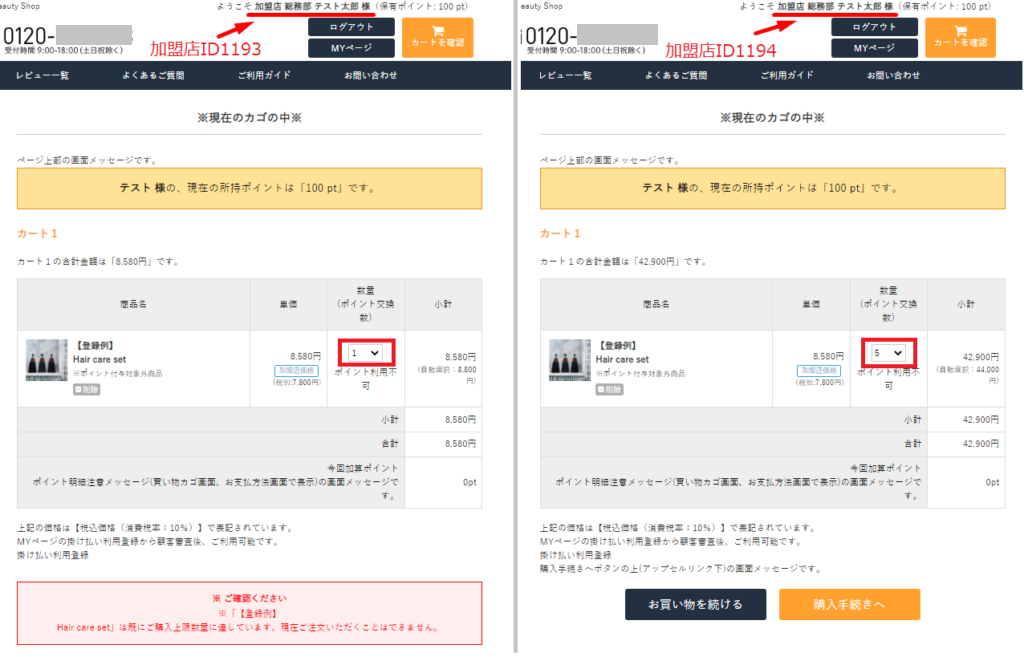 同一加盟店が購入制限を設定した通常商品を設定数量以上購入しようとした場合、買い物かご画面でエラーメッセージが表示されます。