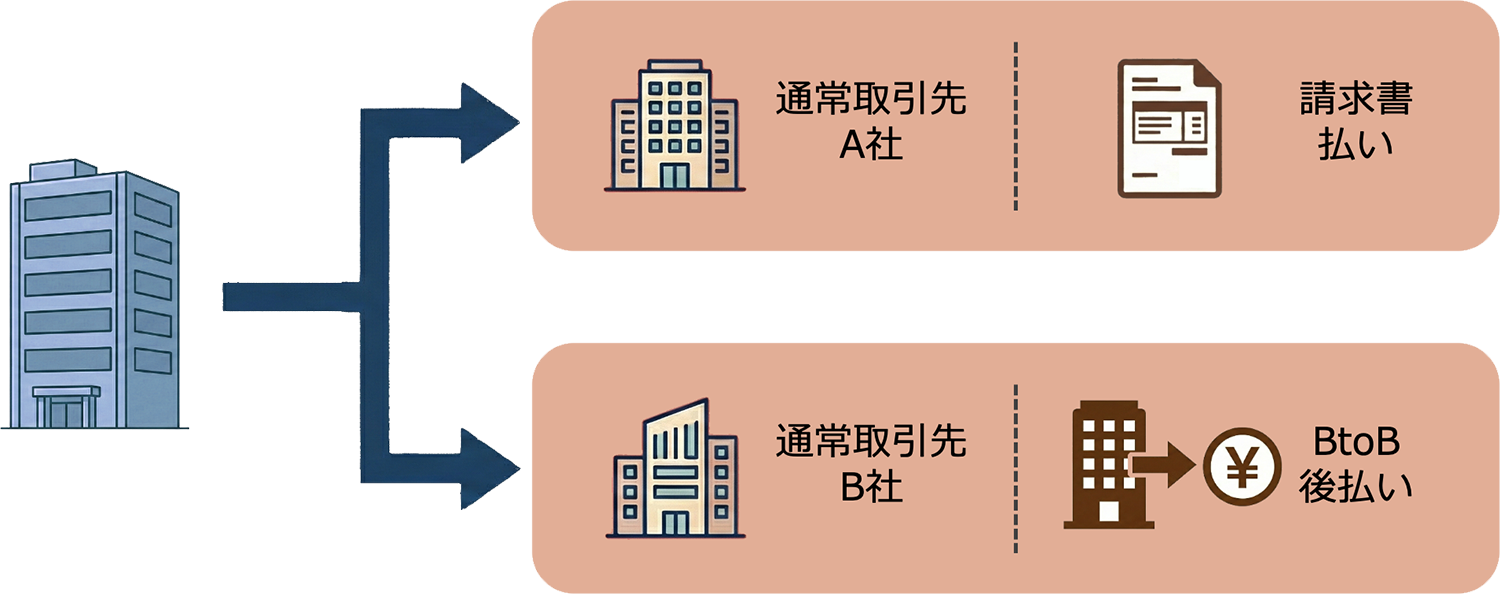 取引先Aは「請求書払い」、取引先Bは「BtoB後払い」といったように、取引先ごとに利用できる決済方法を切り替えられる。