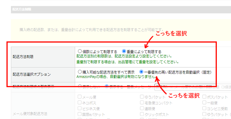 サイズごとの配送方法を用意して重量の上限値を設定しておくと・・・