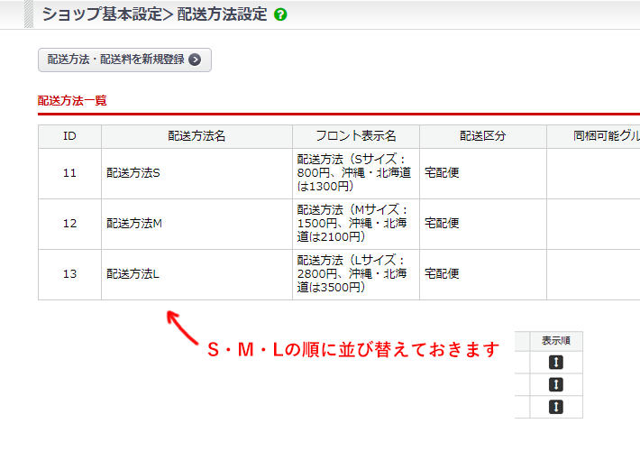 次は配送方法をS・M・Lの3つ登録します!