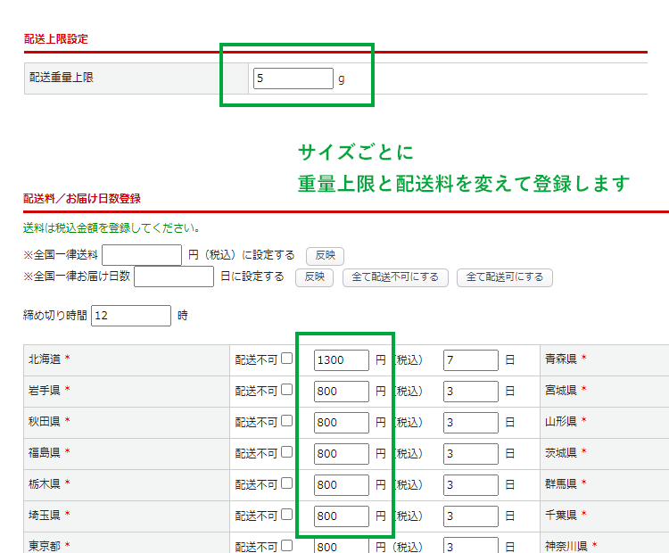 サイズごとに「配送重量上限」と「配送料」を変えて・・・