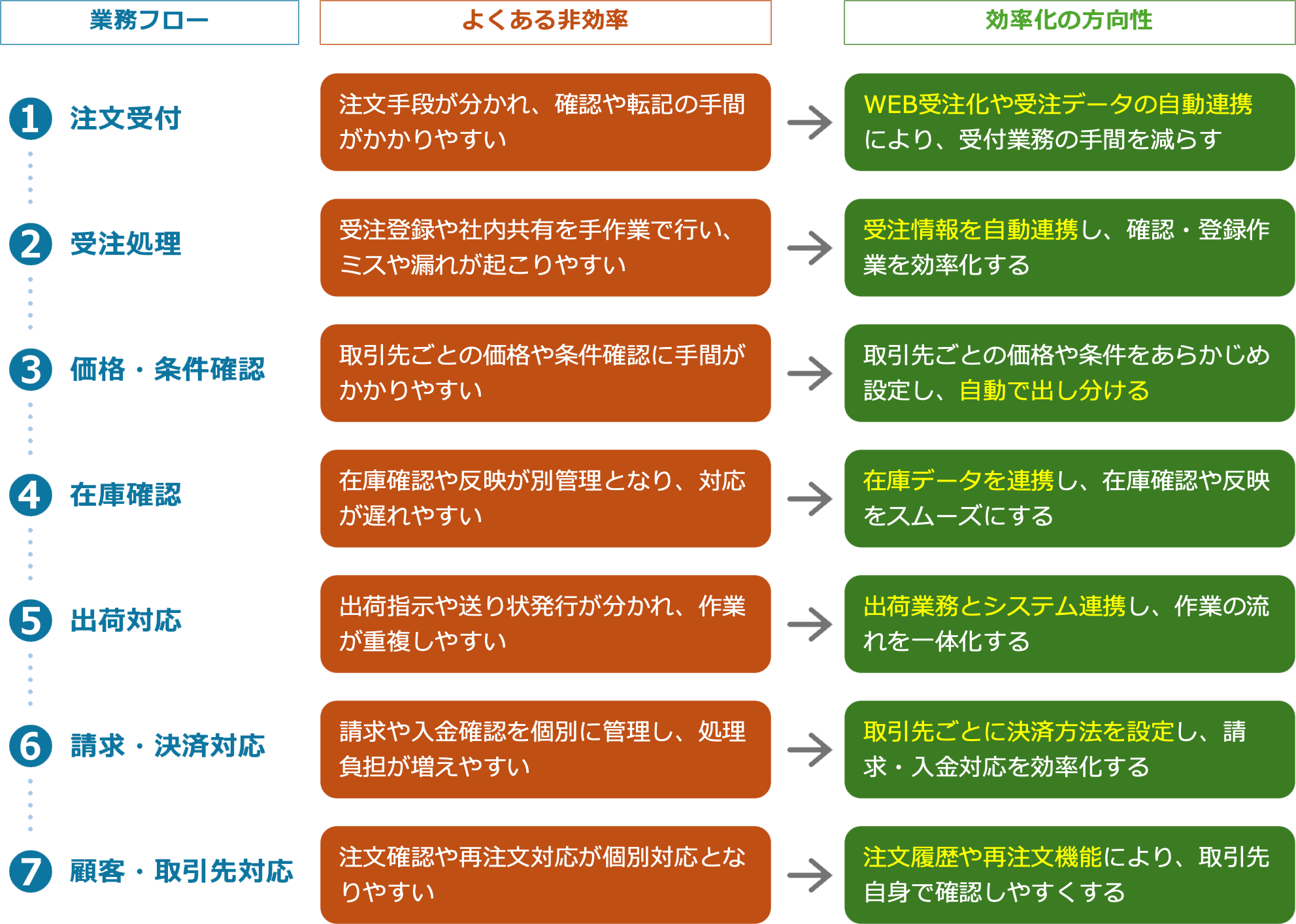 EC業務の効率化といっても、見直すべきポイントはひとつではなく、取引の流れ全体の中に多くの「非効率が生まれやすい工程」があります。まずは、どの業務で負担が増えやすいのか、またどのように効率化するべきかを全体像で整理してみましたので、下図をご覧ください。