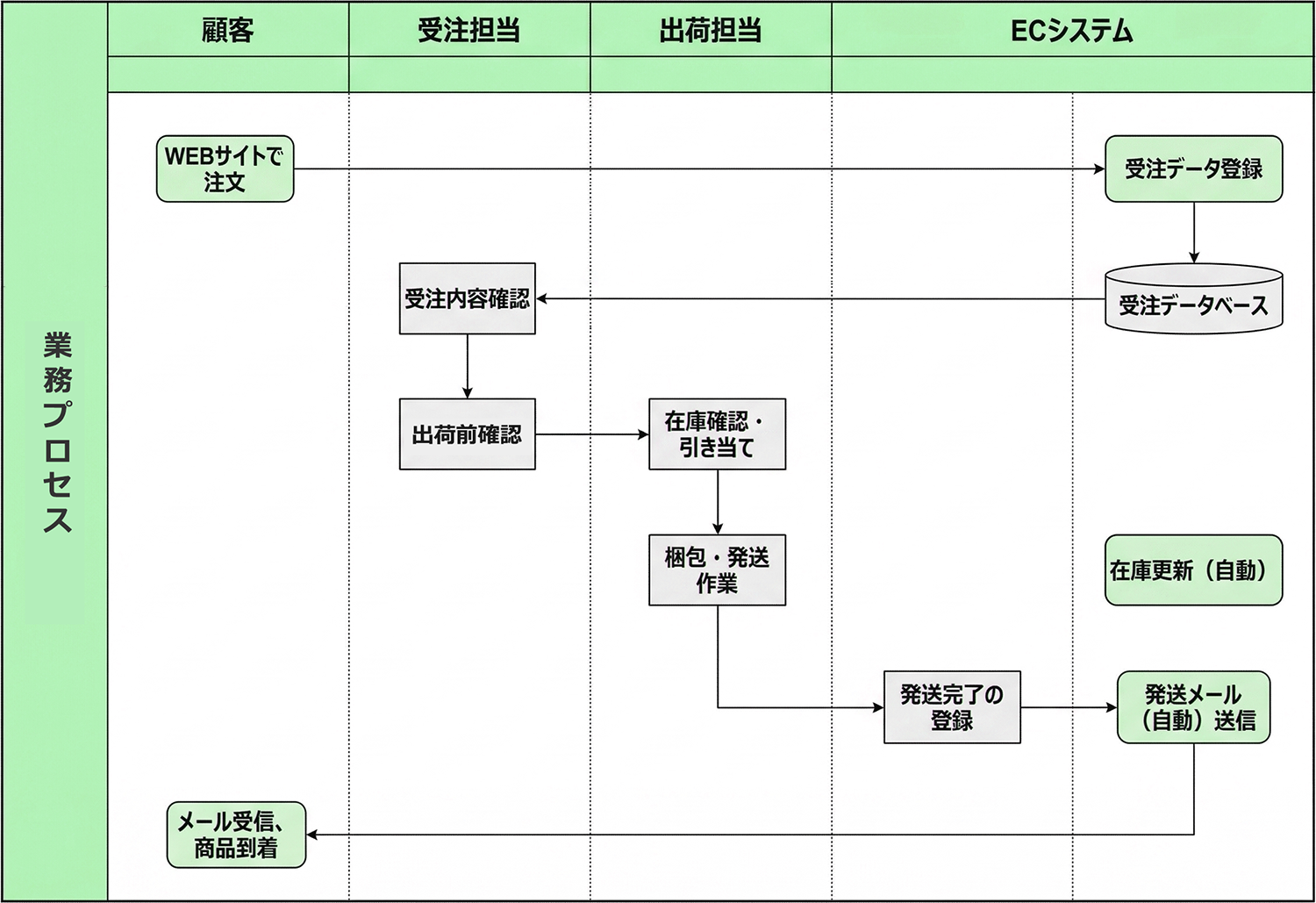 経営者や部門長の方針の明示によりシステムの導入が決まったら、まず最初に行うべきは、現状の業務フローを整理することです。以下のように、注文受付から顧客対応まで、どの工程で誰が何をしているのかを見える形(業務フロー図)にします。