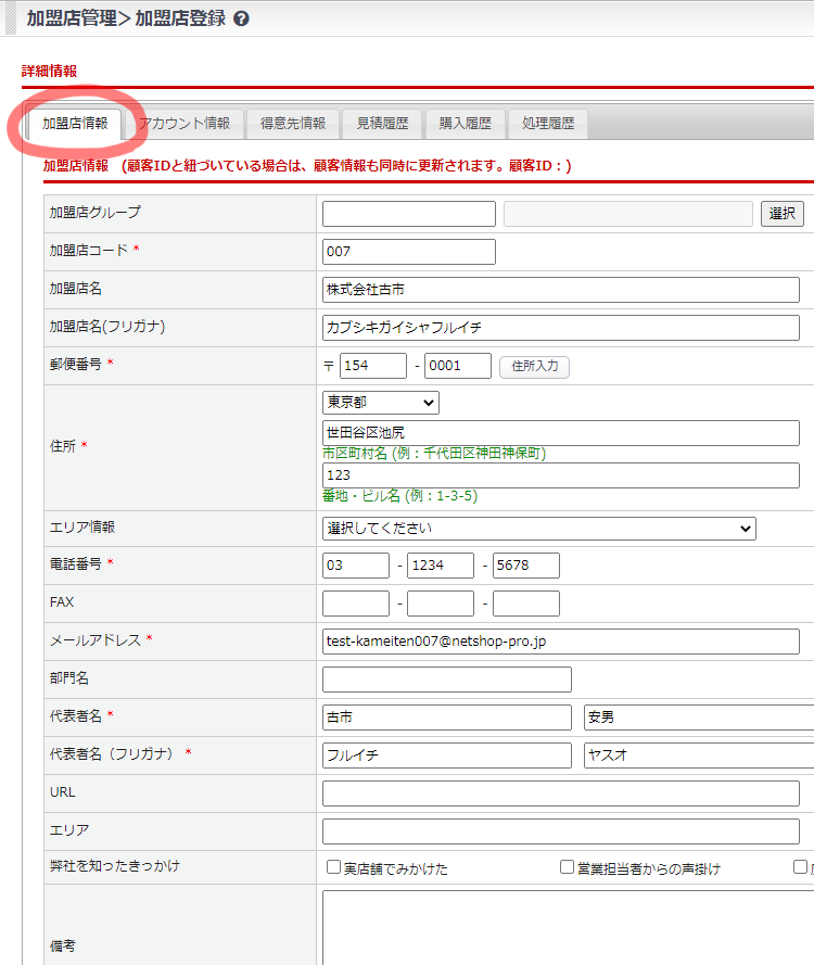 「加盟店情報」タブで*印の必須項目と、加盟店名など分かるところを入力して