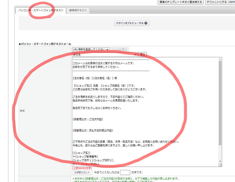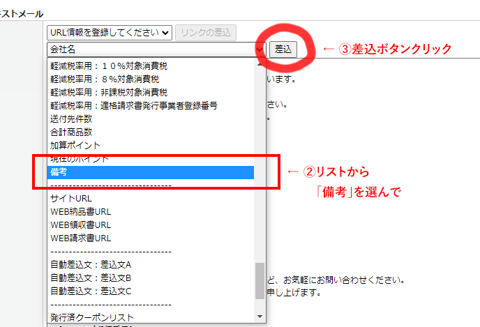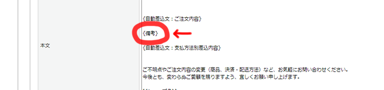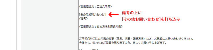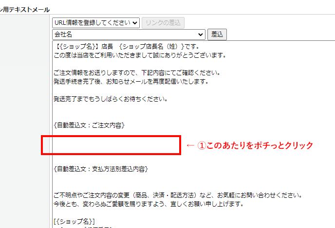 ① {自動差込分:ご注文内容} の下あたりにカーソルを置きまして