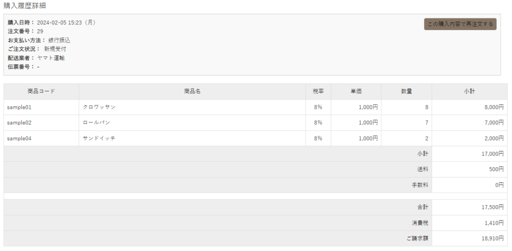 また再注文ボタンがあるため、前回と同じ内容を簡単に注文することが出来ます。
