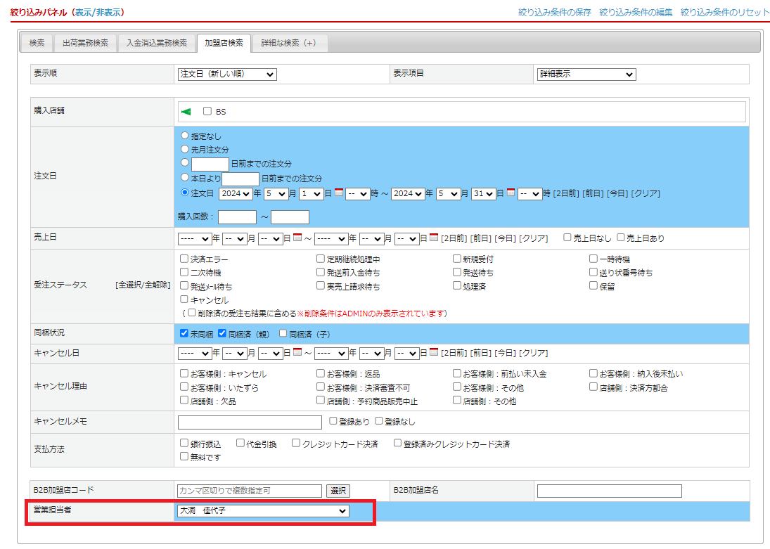 また、営業担当者別に加盟店・受注・見積の詳細を確認したい場合、各一覧でそれぞれ営業担当者を指定し検索することが可能です。