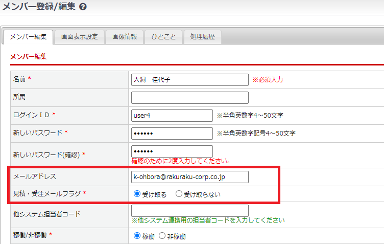 ①のメンバー登録でポイントと記載した、「メールアドレスの登録」と「見積・受注メールフラグを受け取る」にしておくことで、担当加盟店が見積・注文をした際の確認メールが営業担当宛にも届きます。