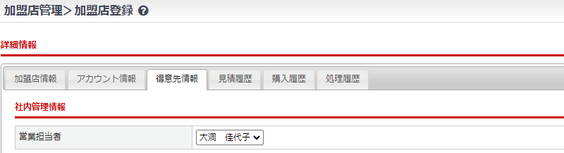 加盟店>加盟店管理「得意先情報」タブの「営業担当者」で担当営業を選択します。