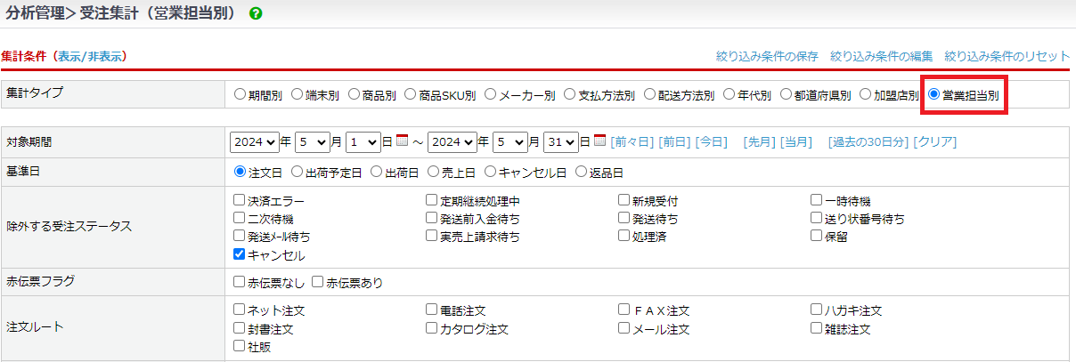 分析管理>受注集計にて営業担当者別に集計が可能です。集計タイプで営業担当者別を選択し、対象期間を設定して集計します。