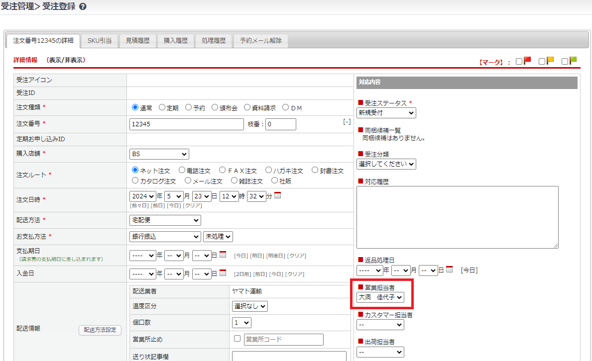 加盟店への登録は①の「加盟店に営業担当者の紐づけ」をご確認ください。加盟店へ営業担当者の登録が完了していると、見積データ・受注データにも自動で営業担当者が紐づきます。手動で紐づける場合は対象の見積・受注データを開き、営業担当者を選択し保存します。