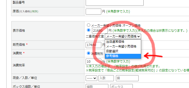 あとは商品編集画面の表示価格で、さっき登録した「参考価格」を選べば・・・
