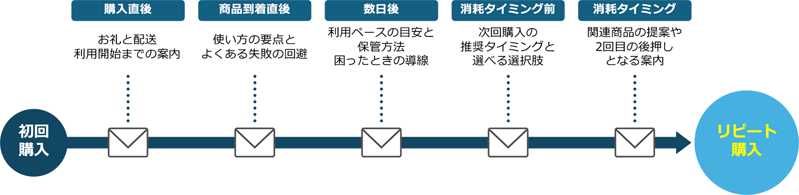 そのため、フォローメールや同梱物などで次回の行動を具体的に促し、迷わず再購入できる導線を作ることがポイントです。