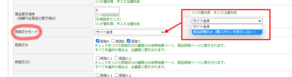 「販路区分モード」を「商品詳細のみ(購入ボタンを表示しない)」にすると