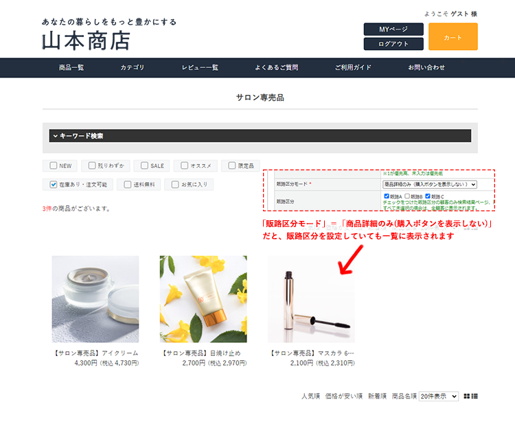 通常「販路区分」を設定している商品はカテゴリページに表示されませんが・・・