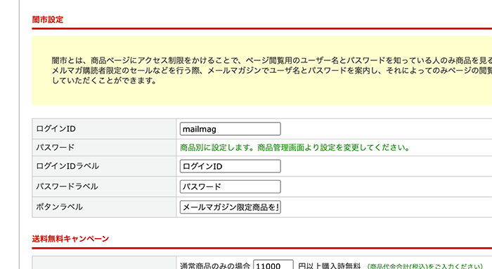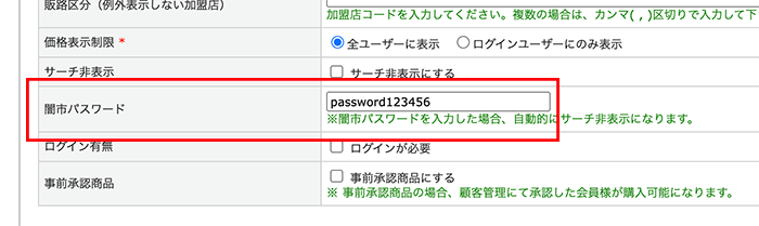 パスワードは、商品編集画面で「闇市パスワード」項目で設定します