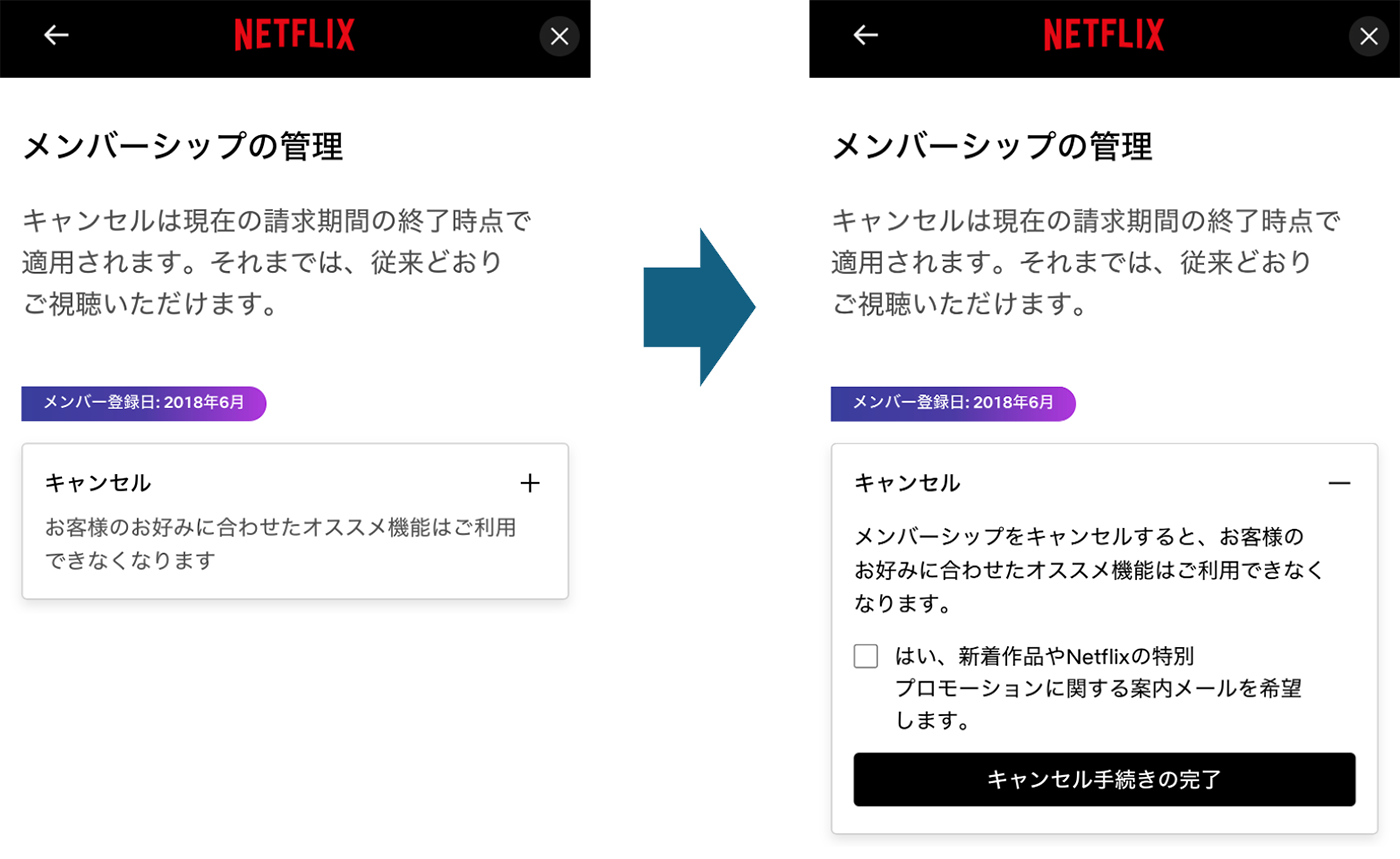 以下はNetflixのマイページ画面ですが、たったの2〜3手順でアカウントのキャンセル(解約)が可能になっています。