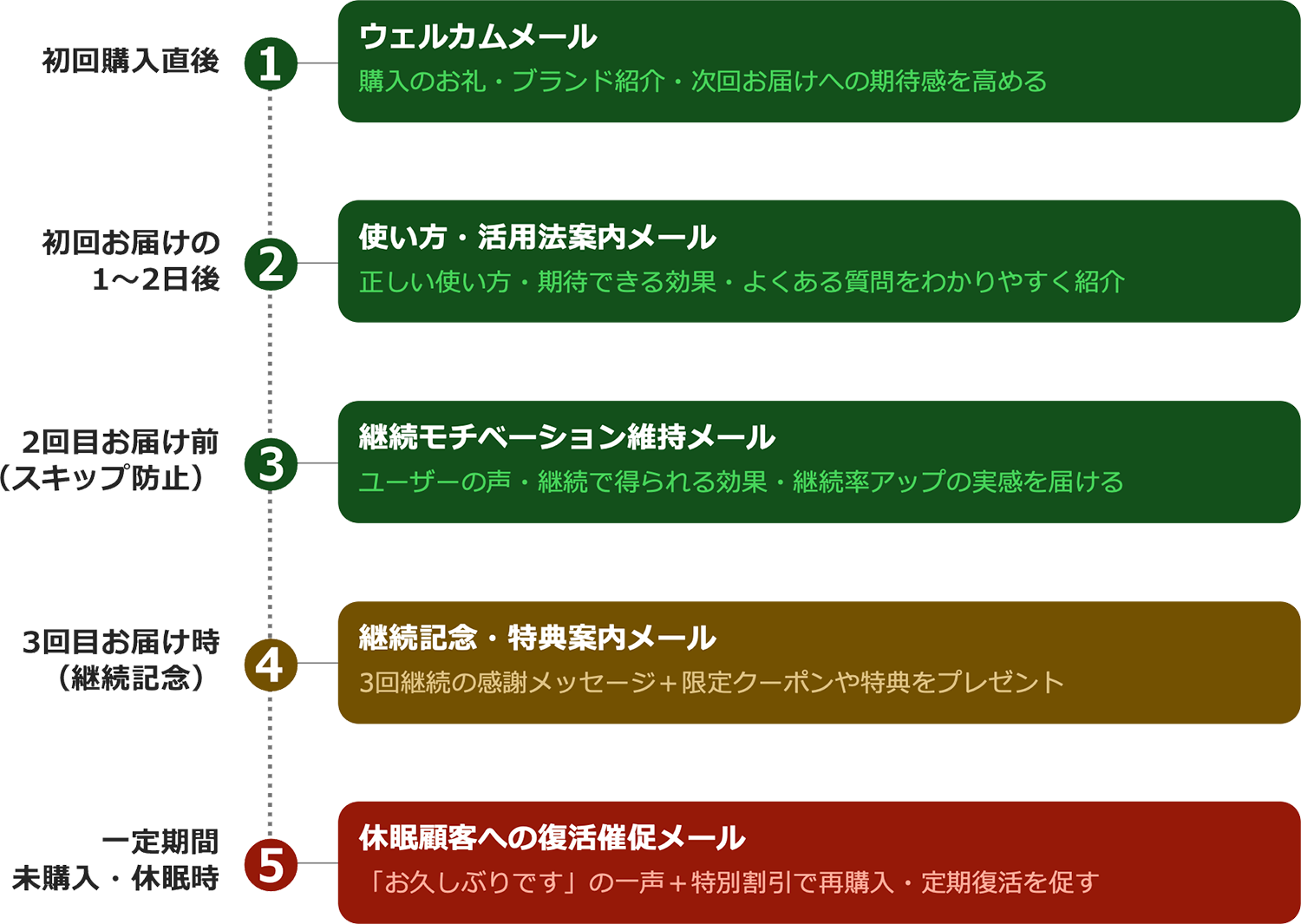 さらに、3回目継続時に記念クーポンを送る、一定期間購入がない顧客に復活促進メールを配信するといったように、継続回数や行動データに応じて内容を分岐できれば、よりきめ細かなCRM施策が可能になります。