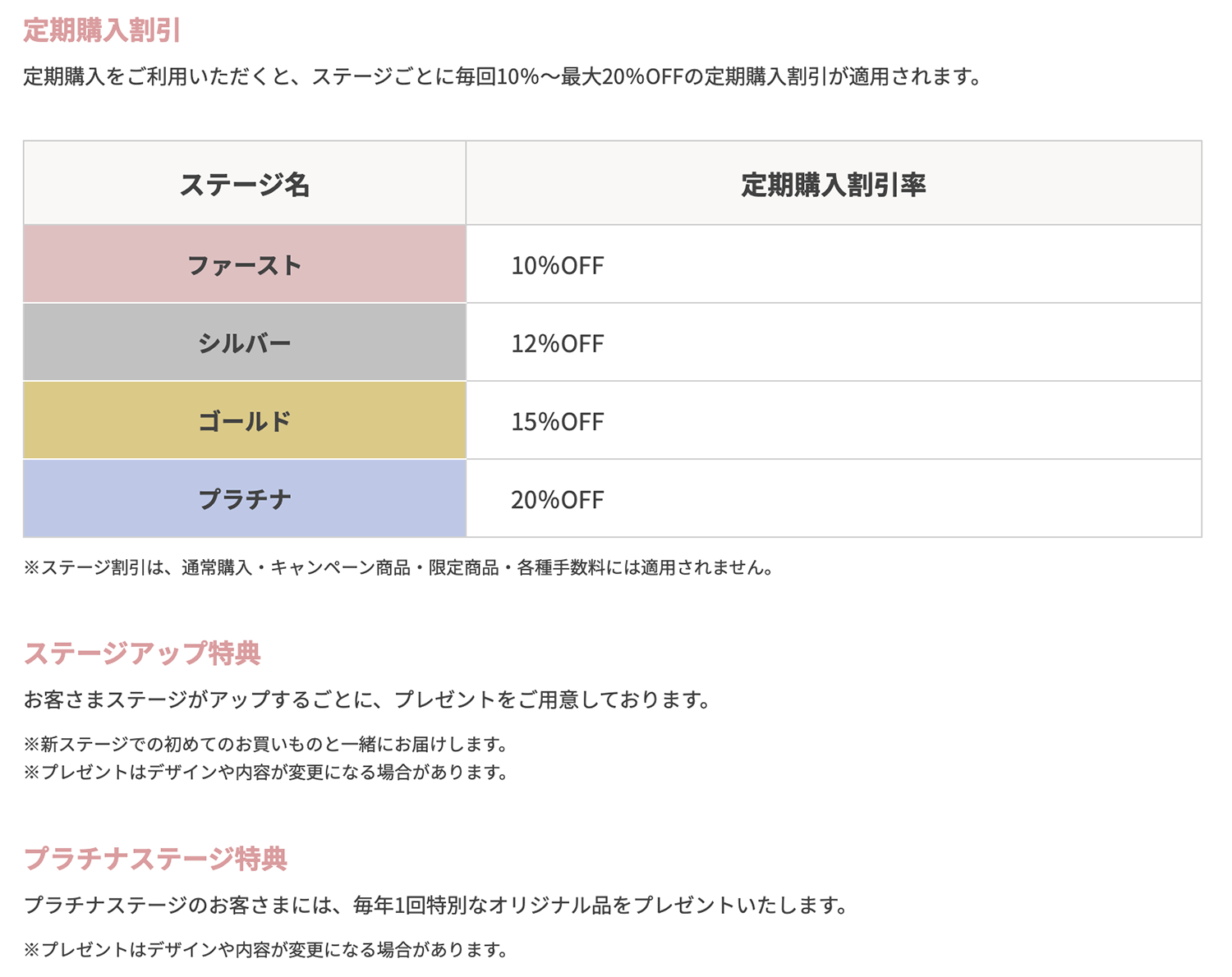 例えば、化粧品・健康食品の大手通販ブランドの新日本製薬の公式オンラインショップでは、累計購入金額に応じてファースト・シルバー・ゴールド・プラチナの4段階のステージが設定されており、定期購入をすると各ステージごとに毎回10%〜最大20%OFFの割引が適用される設計になっています。