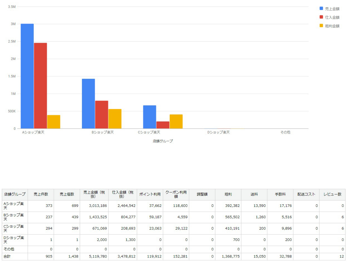 | 粗利 | 売上金額(税抜)- 仕入金額(税抜)- クーポン利用額- 調整額= 粗利 |