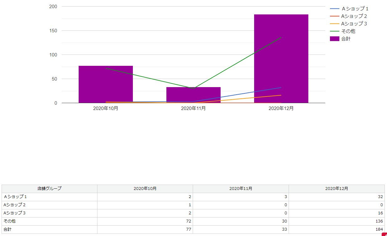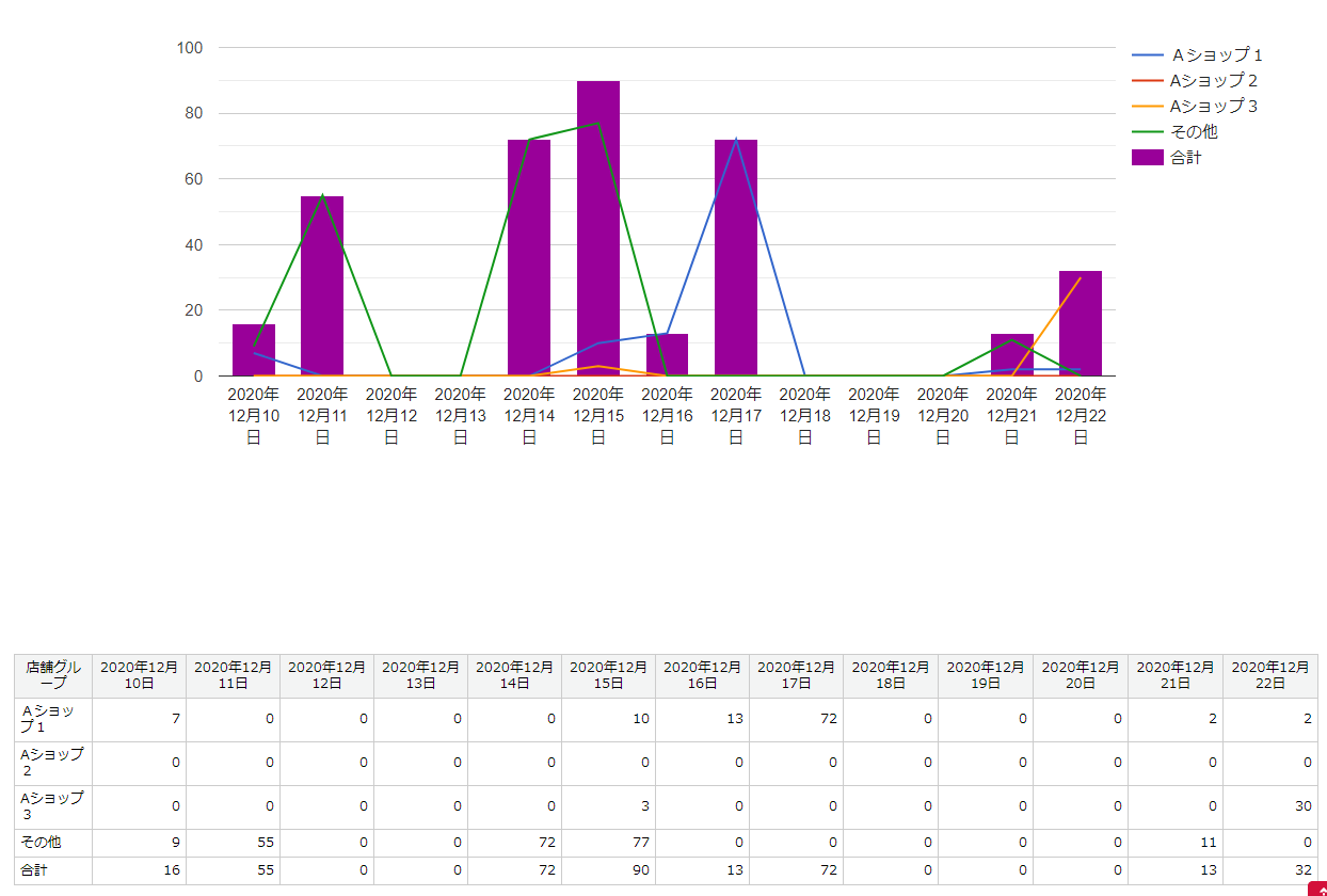 | 対象期間(集計単位で選択の単位 日、月、年) | 各集計項目の値 |
