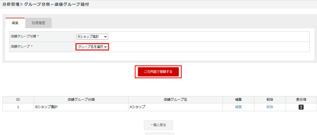 店舗グループから該当グループを選択し、【この内容で登録する】ボタンをクリック。