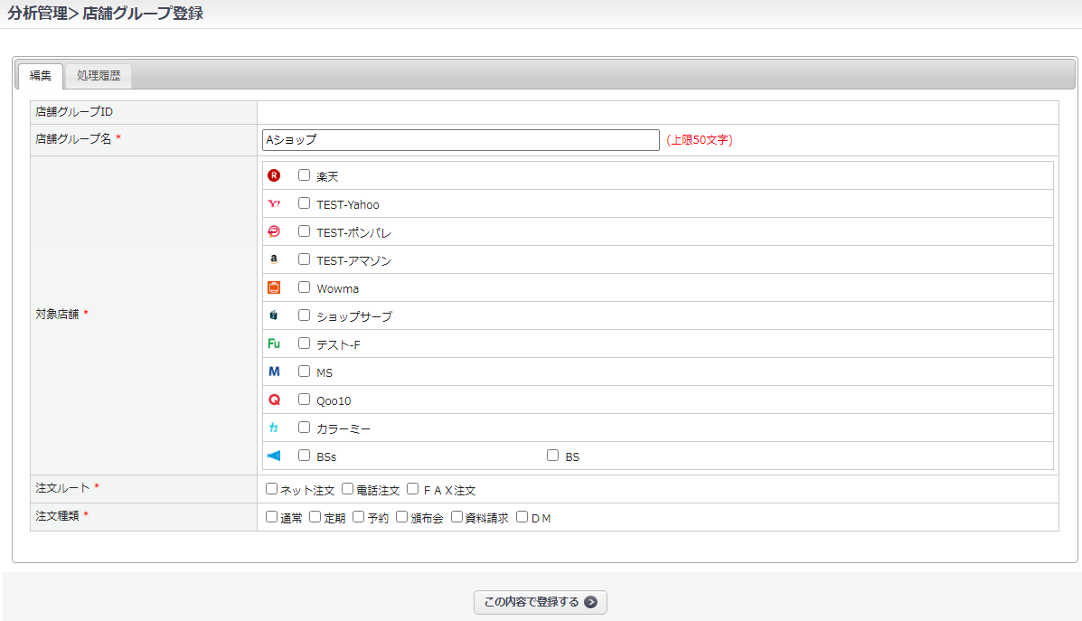 そのグループに振分けたい店舗、注文ルート、注文種類にチェックし 、【この内容で登録する】ボタンをクリック