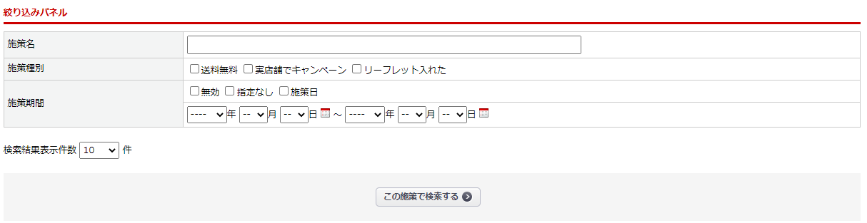 施策名、施策種別、施策期間を入力し【この施策で検索する】ボタンをクリックすると