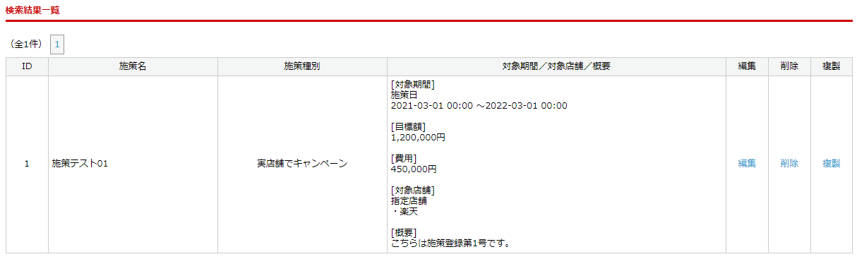 該当する施策データが下部の検索結果一覧に表示されます。