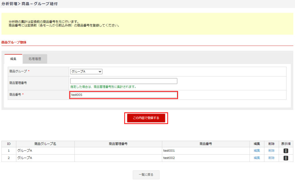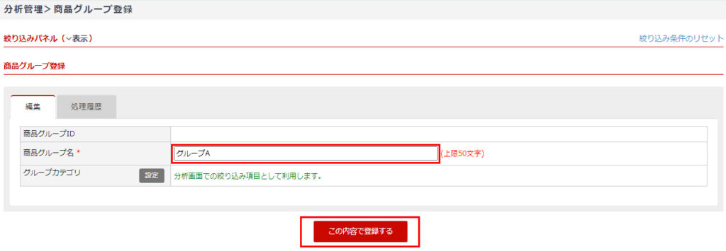 商品グループ名に任意のグループ名を入力し、【この内容で登録する】ボタンをクリック