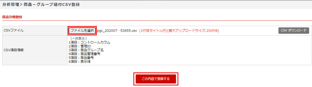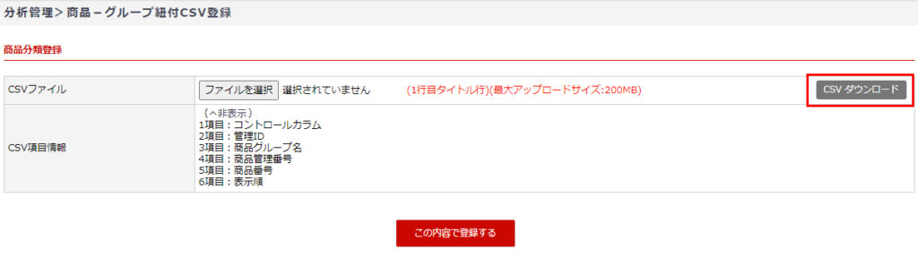 分析管理>グループ設定>商品 – グループ紐付 CSV 登録