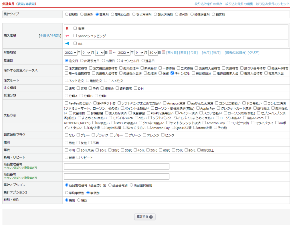 | 基準日 | 対象期間の基準とする日を設定 注文日:注文日が対象期間内の受注データを集計対象とします。 出荷予定日:出荷予定日が対象期間内の受注データを集計対象とします。 出荷日:出荷日が対象期間内の受注データを集計対象とします。 キャンセル日:キャンセル日が対象期間内の受注データを集計対象とします。 返品日:返品日が対象期間内の受注データを集計対象とします。 |