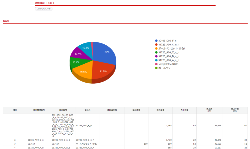 各商品ごとの「売上数量」「売上高(円)」「売上件数」の集計が可能です。