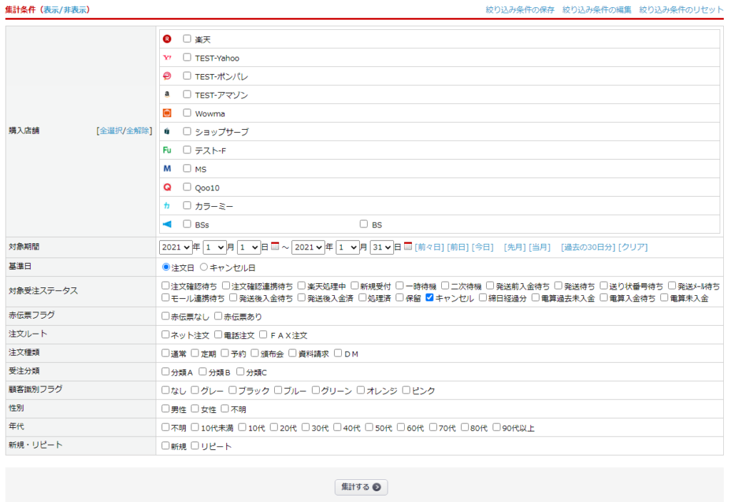 | 基準日 | 基準とする日を設定 注文日:注文日が対象期間内の受注データを対象として集計します。 キャンセル日:キャンセル日が対象期間内の受注データを対象として集計を行います。 |