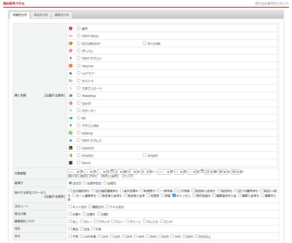| 購入店舗 | 集計対象とする購入店舗を設定 ※選択のない場合は全項目が集計対象となります。 |