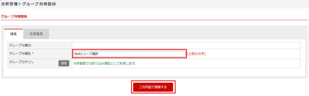 グループ分類名に任意の分類名を入力し、【この内容で登録する】ボタンをクリック。