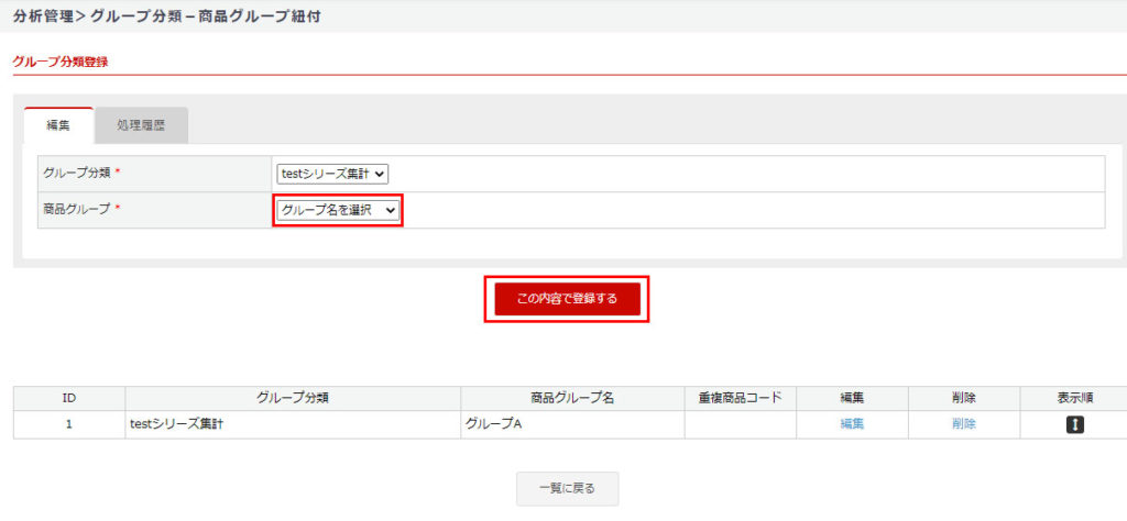 商品グループから該当グループを選択し、【この内容で登録する】ボタンをクリック。