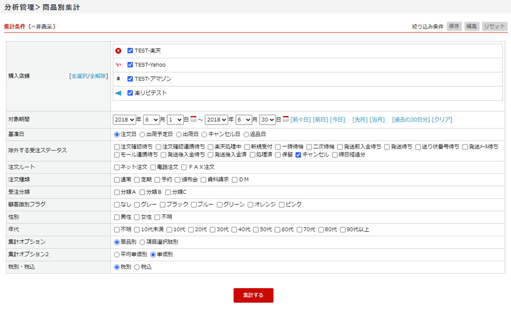 | 集計オプション | 商品別・規格別を指定します。 商品別:1商品(商品ID)ごとに表示されます。 商品規格別:規格設定がある場合は規格ごとに表示されます。 項目選択肢別:商品番号が同一の場合でも、価格や商品名が異なる場合は別明細で集計されます。 |