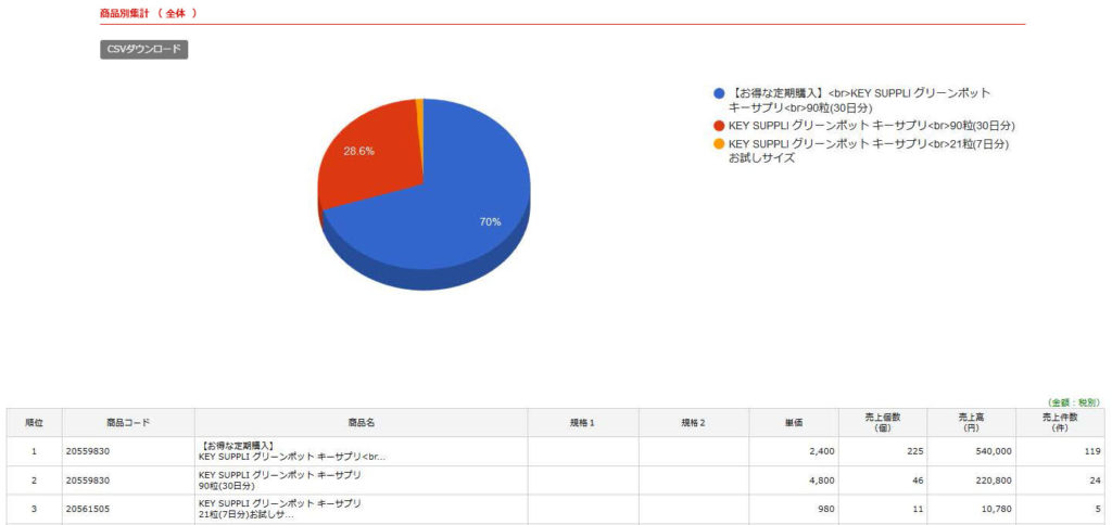 商品毎の売上個数・売上高・売上件数が表示されます。