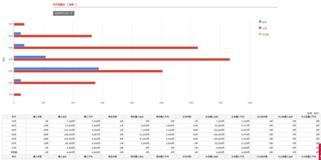 年代毎の購入件数・ 購入合計・購入平均が表示されます。