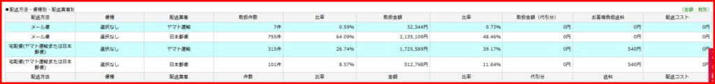 配送方法毎に件数と比率・金額と比率が表示されます。