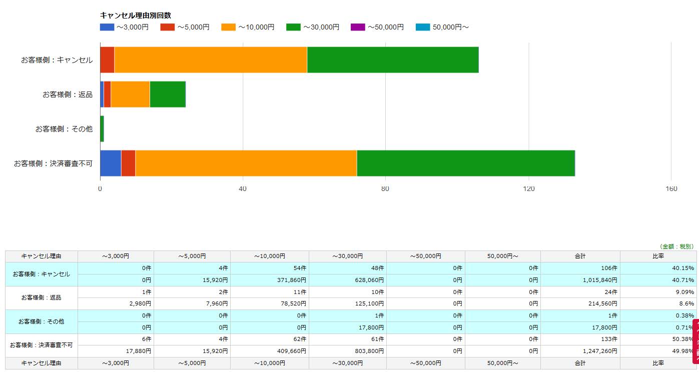 キャンセル理由・金額別に件数・合計金額・比率が表示されます。