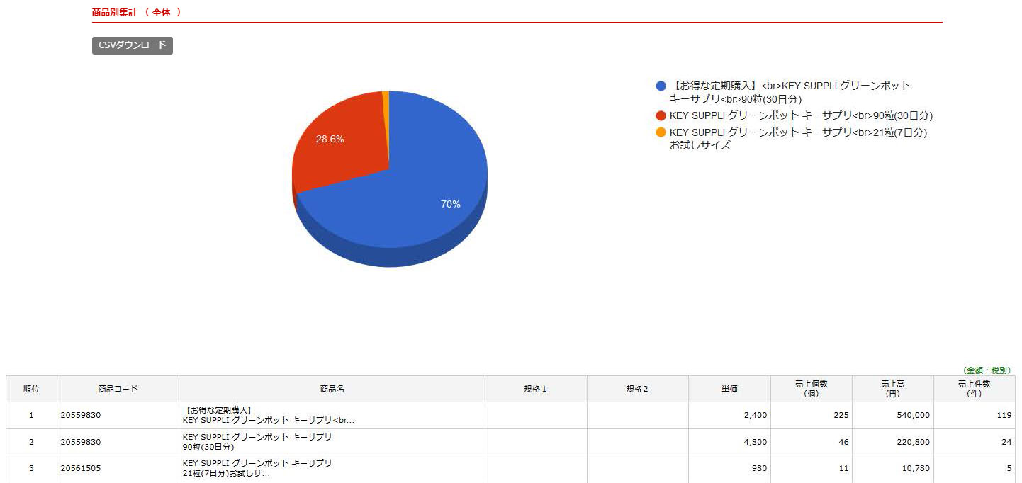 商品毎の売上個数・売上高・売上件数が表示されます。