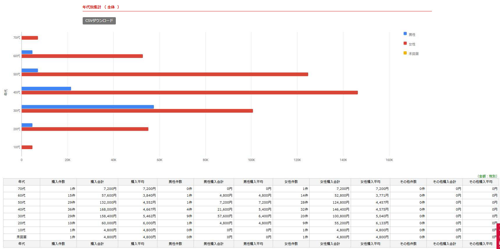 年代毎の購入件数・ 購入合計・購入平均が表示されます。