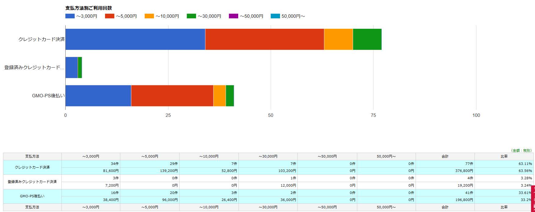 決済方法・金額別に件数・合計金額・比率が表示されます。