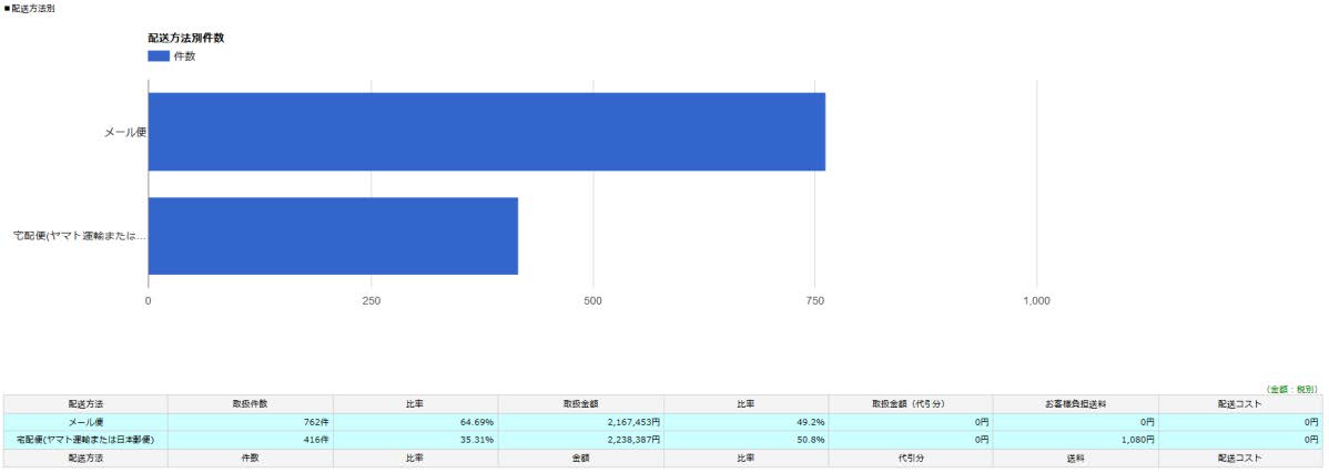 配送方法毎に件数と比率・金額と比率が表示されます。
