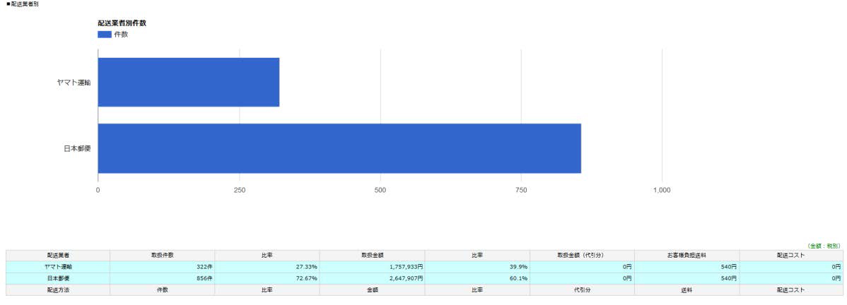 配送業者毎に件数と比率・金額と比率が表示されます。