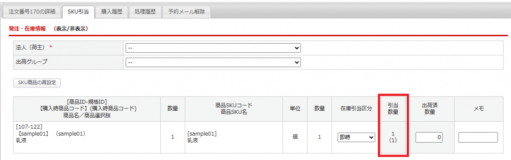 受注データのSKU引当タブで引当数量に数字が入っていれば引き当て済みです。